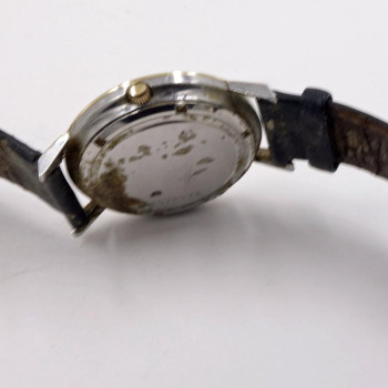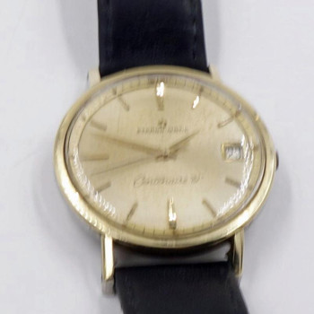 4570526Funktionen: Stunde, Minute, Sekunde und DatumGehäuse: verguldetDurchmesser: 35 mm ohne KroneArmband: Schwarzes Lederband mit DornschließeBesonderheit: DatumZustand: Getragener guter Zustand mit leichten TragespurenBox/Papiere: neinHerstellung ca.: 70er JahreHerstellernummer: nicht zutreffendMarke: EternaProduktart: ArmbanduhrAbteilung: DamenStil: Elegant