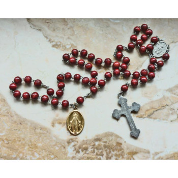 Edler Rosenkranz mit roten Perlen in Metall Maria vergoldet Beten Glauben